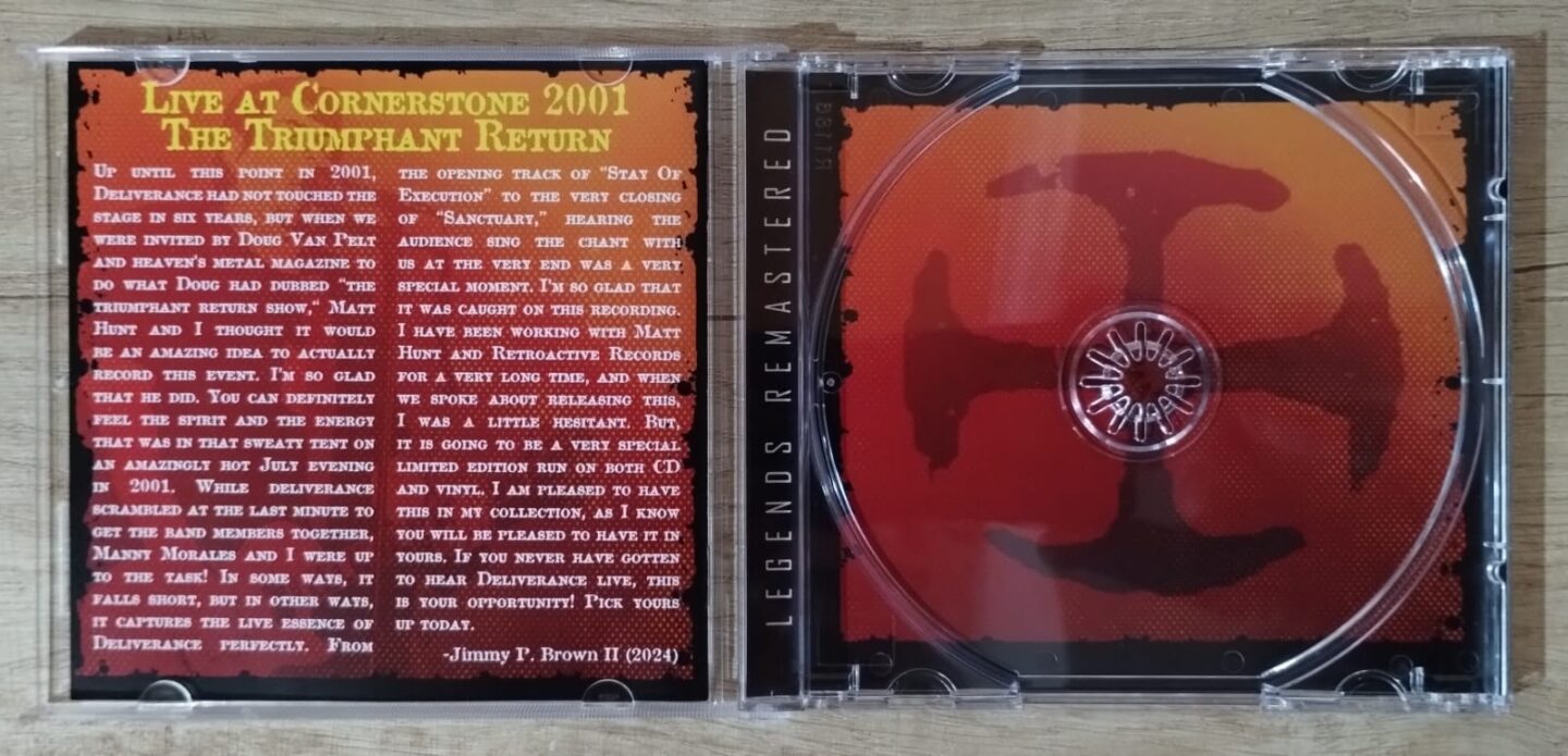 This new edition of “Live At Cornerstone Fest 2001” is not just a mere reissue. This new version has been completely reconfigured and includes a new cover, totally different from the original, replacing the original illustration with a photo of Jimmy P. Brown II playing live (we assume from that show). Strangely enough, the inner sleeve includes the lyrics to the songs, something that is not customary on a live album but is welcome nonetheless! It also includes the story of how this Deliverance reunion came about, told by Jimmy P. Brown II himself, and the reason for this reissue. In addition to all this, there are several photos of the band playing live. All of this is only available, of course, in the physical editions of this material, both on CD and vinyl. The graphic quality of the physical edition is not only good but also worth purchasing.