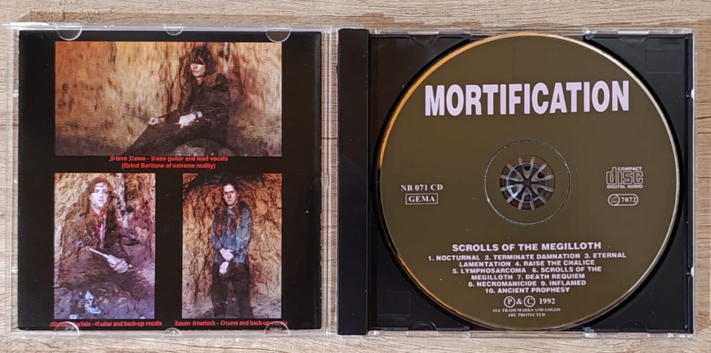 The album had several versions and was even reissued several times. We are fortunate to have in our hands a 2005 reissue by Rowe Productions (the record label founded by Steve Rowe himself), which includes bonus tracks that accompany the original playlist. These are four original demos from the recording that Mortification made prior to recording this album. Strictly speaking, “Terminate Damnation,” “Lymphosarcoma,” “Necromanicide,” and “Scrolls Of The Megilloth” are the demos in question, which sound much rawer and wilder than their corresponding “official” versions. It’s a way to hear how Mortification worked with their sound. Tremendously rough, hard, and gratifyingly heavy.