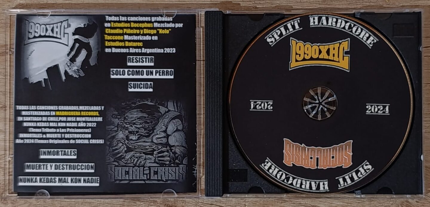 Por gentileza del amigo “Vaky” Ramirez (voz de 1990XHC), pudimos tener nuestra copia de esta producción independiente llamada “Split Hardcore 2024”, compartida justamente entre la banda argentina 1990XHC y Social Crisis de Chile. Esta producción consta de 6 temas, repartidos en un 50 por ciento por cada banda; ergo, tres temas son de 1990XHC y los otros temas de Social Crisis, en una especie de muestra gratis de la brutalidad que cada banda, a su manera, despliega.