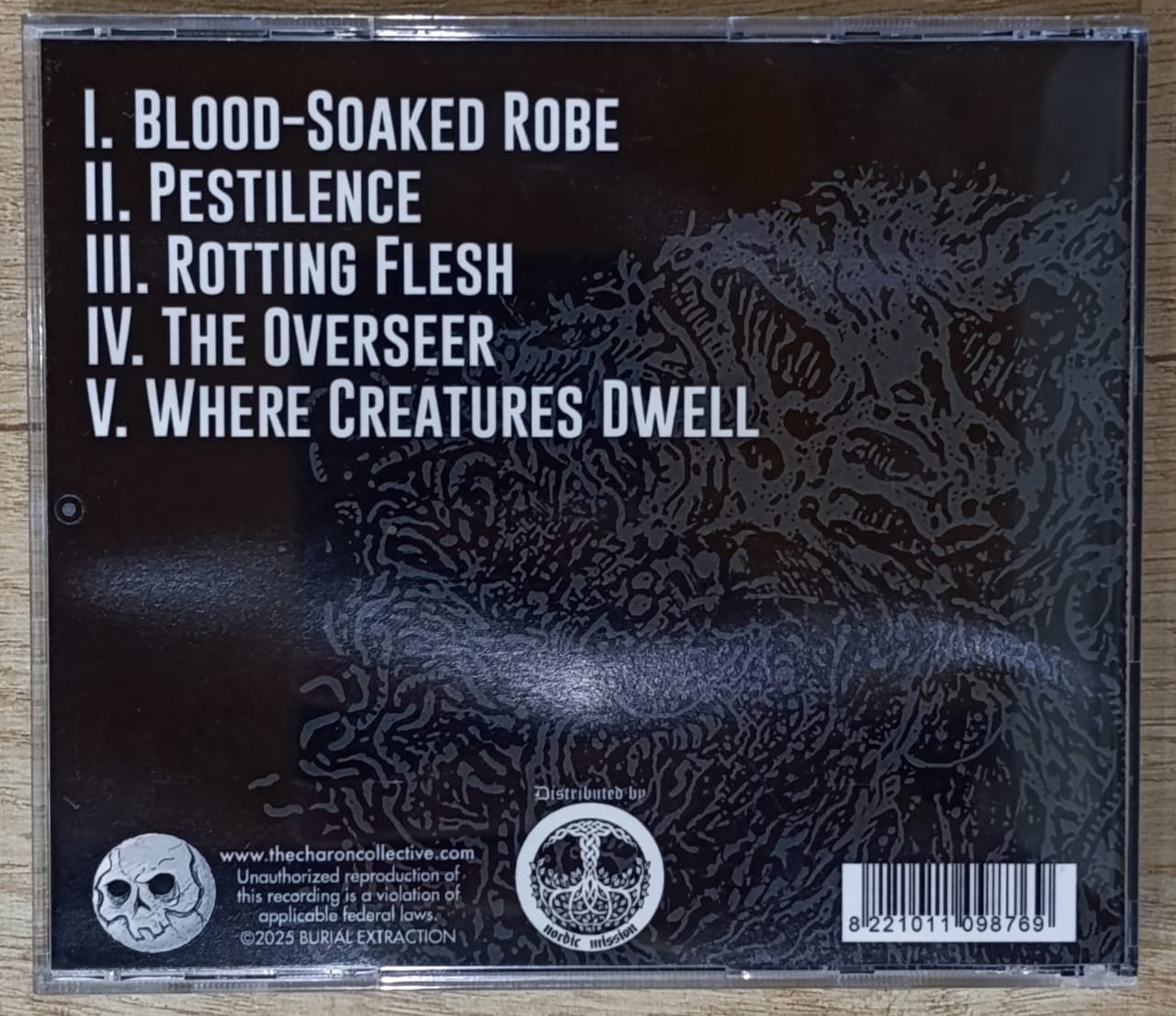 The cover says it all. It’s one of those illustrations that help us grasp the content of this EP, and in that regard, Burial Extraction opted for the simplicity and generic style characteristic of Death Metal. No grandiose images in an era where AI reigns supreme. Basic but clear. Just like the inner sleeve, which actually doesn’t exist since this edition only features the aforementioned cover art, and on the back, the necessary technical details, and nothing else.